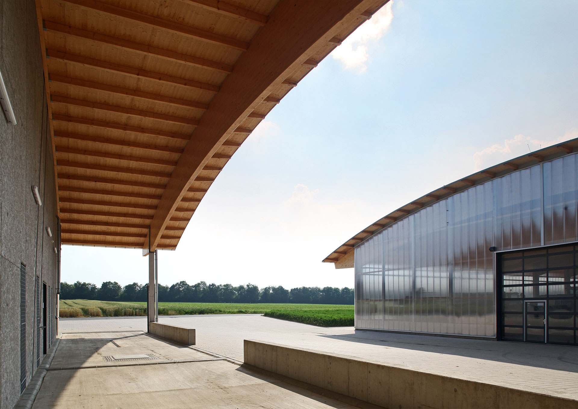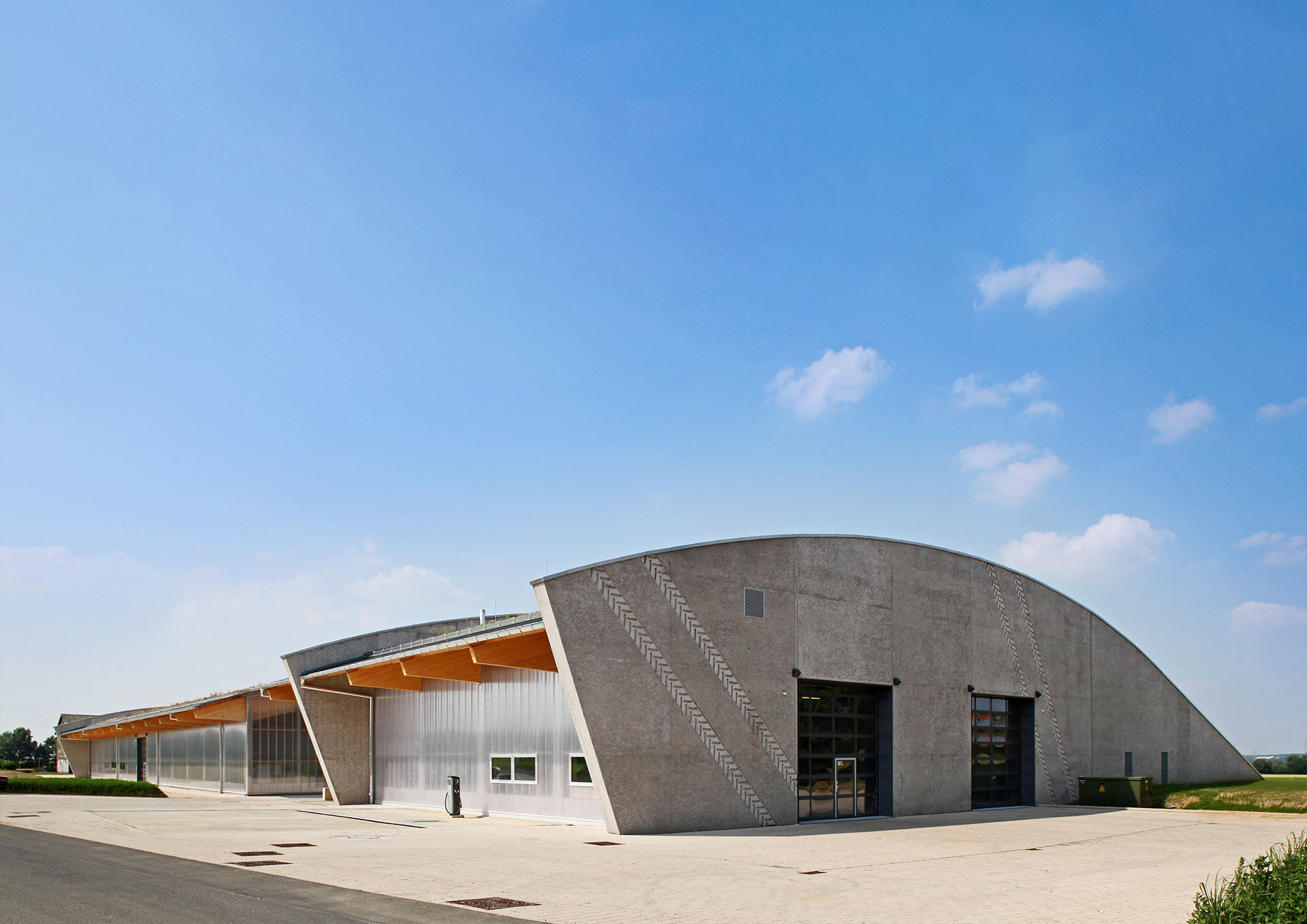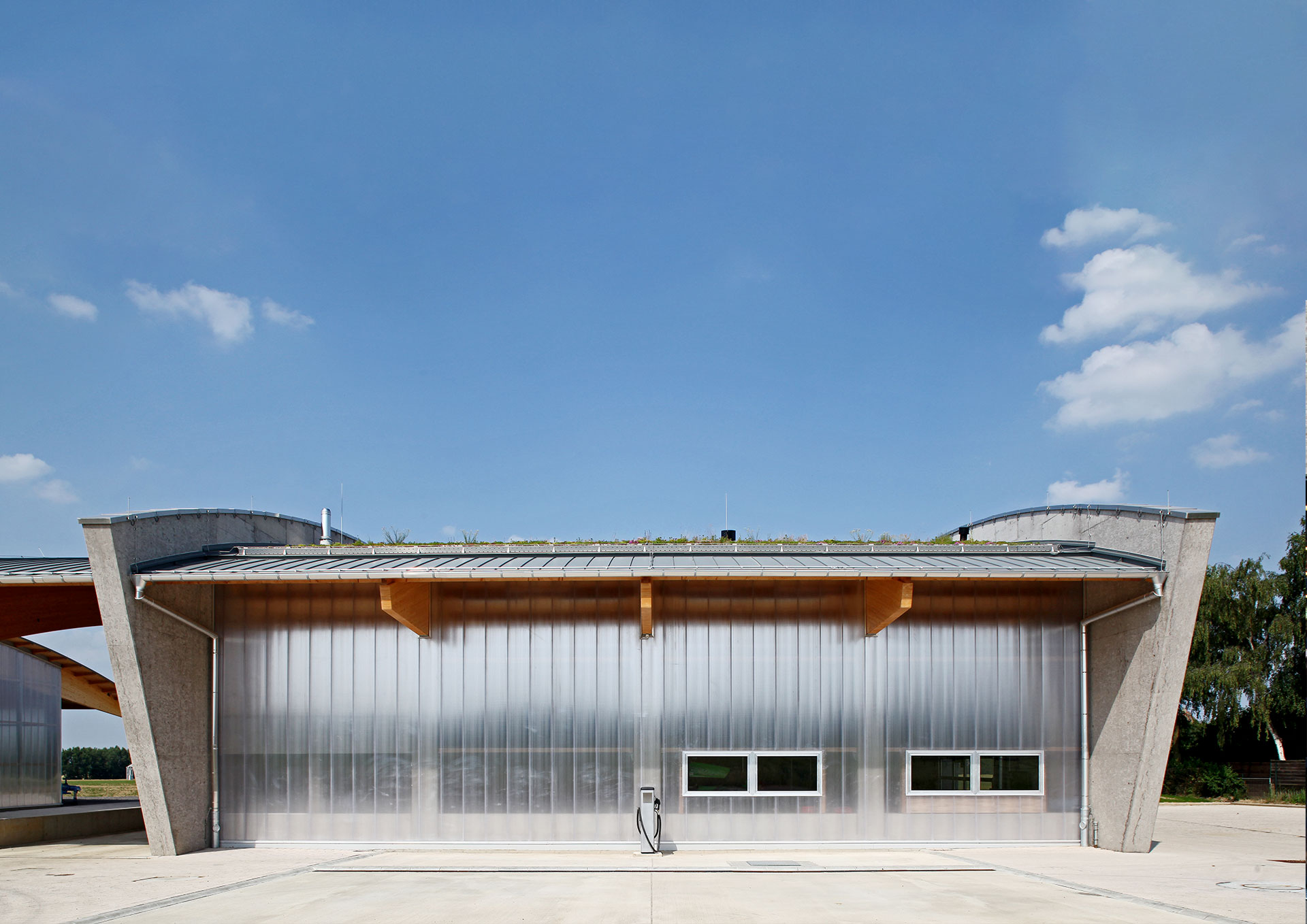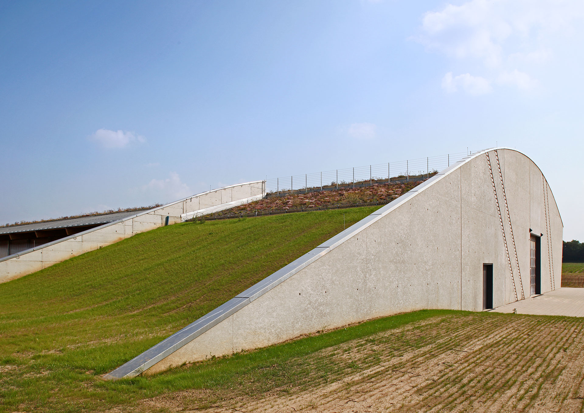 Projektbeschrieb: Mit :agrohort entsteht auf Klein-Altendorf ein so genanntes Science-to-Business Center. Es geht hier um die nachhaltige Energieversorgung und die Anpassung an den Klimawandel bei der Produktion von Nahrungs-pflanzen. Die pure, unverfälschte Beton-Ästhetik stand beim Bau der neuen Werkstatt- und Maschinenhalle des Campus Klein-Altendorf im Vordergrund. Die charakteristischen halbrunden Wandscheiben wurden deshalb massiv und ohne zusätzliche Wärmedämmung aus Liapor Leichtbeton in Sichtbeton-Optik gefertigt. In die Außenwände eingebrachte Traktorspuren stehen dabei für die agrartechnische Nutzung des Objekts.