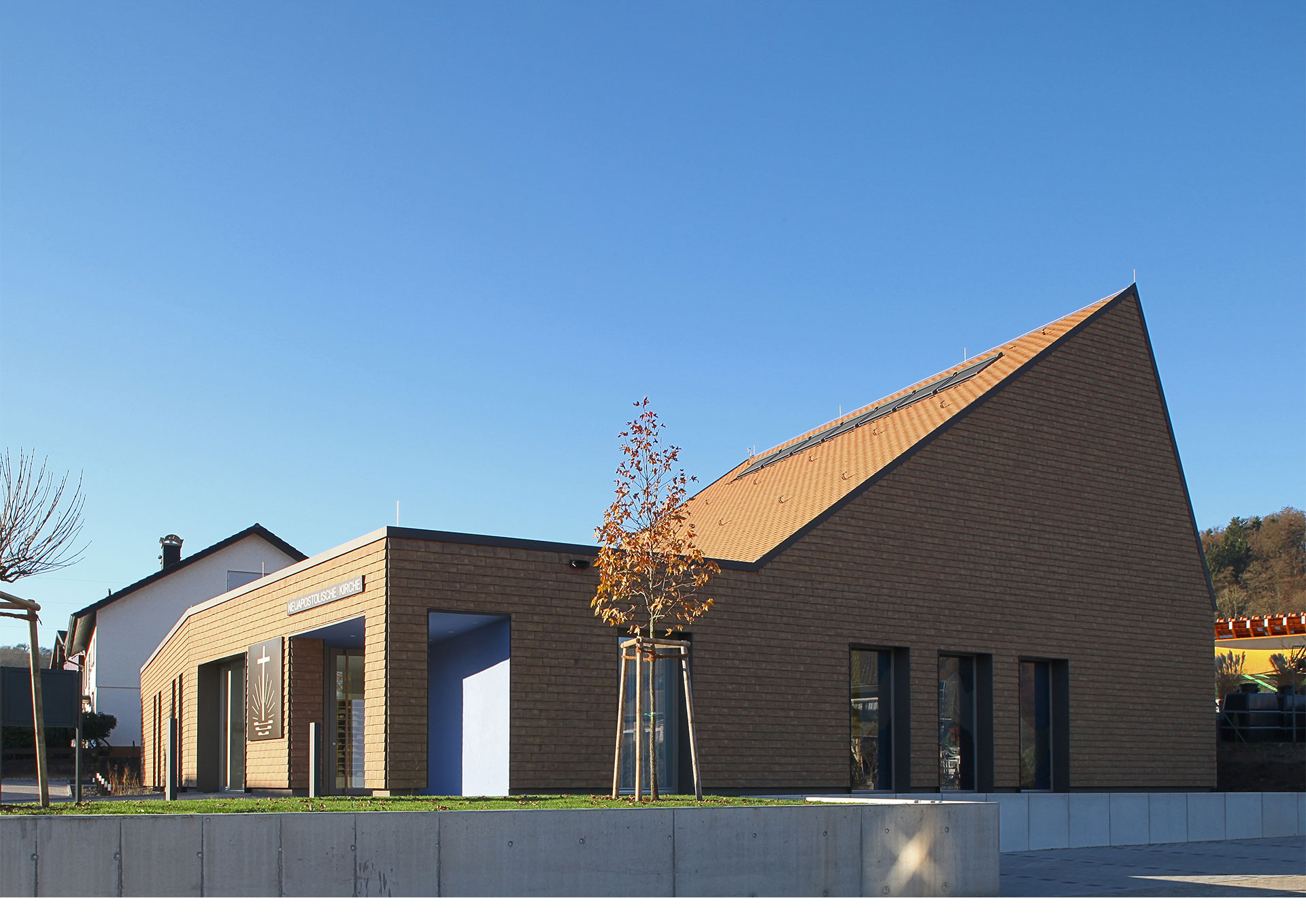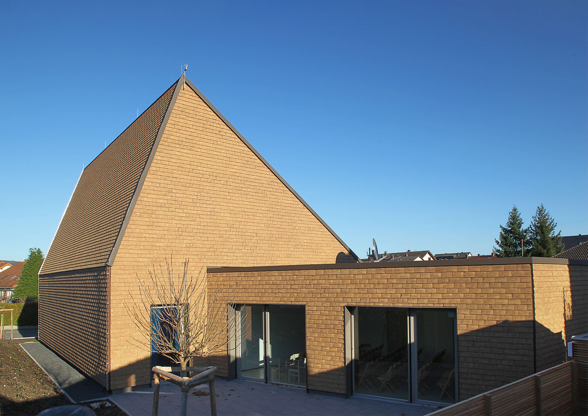 Projektbeschrieb: Das Erscheinungsbild wird geprägt durch eine Fassade, bei der Ziegelplatten gewählt wurden. Diese werden für Dach und Wand gleicher-maßen eingesetzt. Das Gebäude wird so zu etwas Ganzheitlichem, als wäre es aus nur einem Material entstanden. Das Gebäude erscheint monolithisch, ohne Überstand, Dachrinnen und Bruch zwischen Wand und Dach.