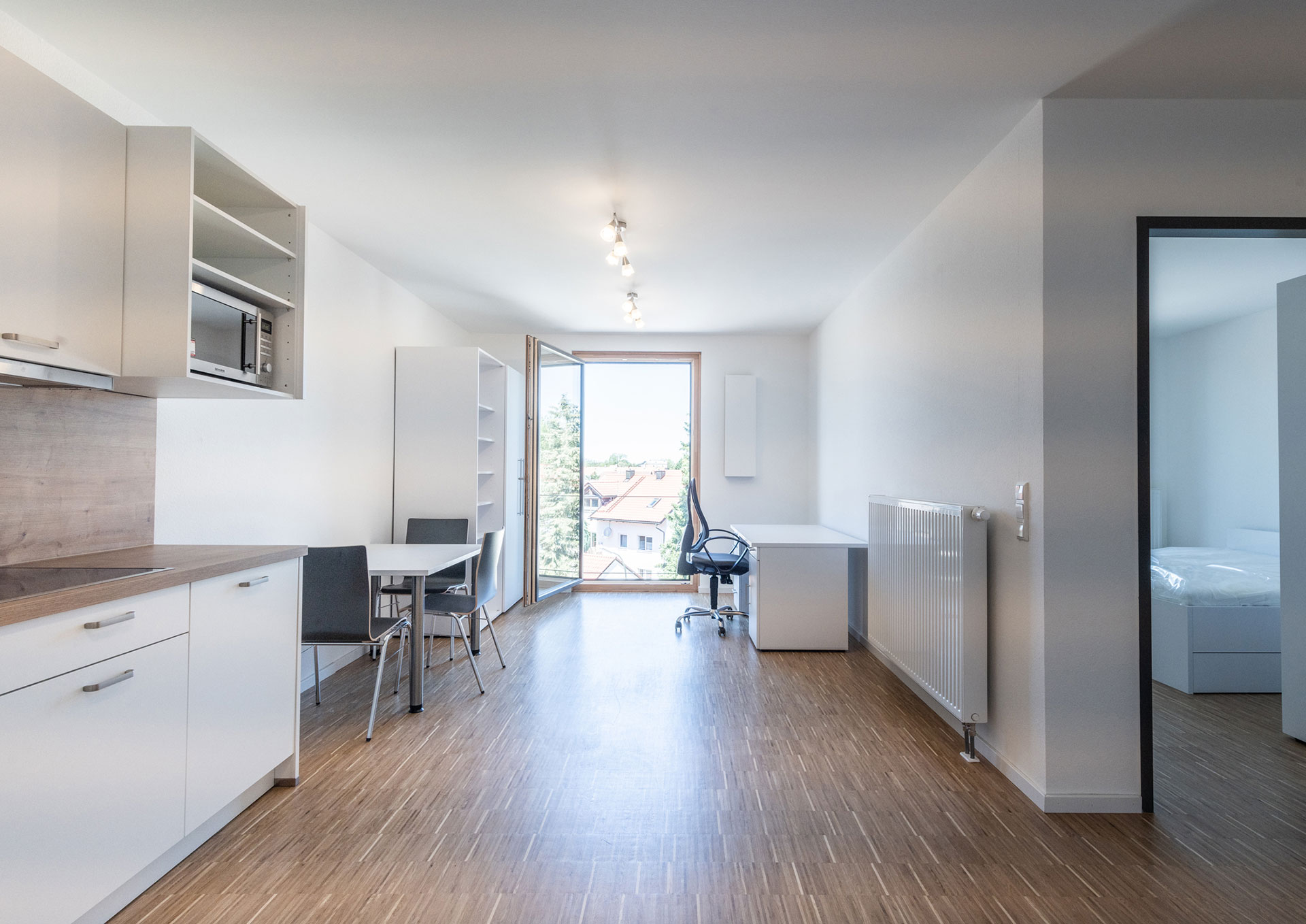 Projektbeschrieb: Der viergeschossige Neubau reagiert durch zweifaches Knicken auf die große Länge, die Baumasse wird hierdurch kleinteiliger. In den „Knickbereichen“ sind Aufenthalts- und Kommunikationsflächen situiert. Es werden insgesamt 90 Einzimmer-Apartments, 15 Zweizimmer-Wohnungen und 6 Dreizimmer-Wohnungen angeboten.