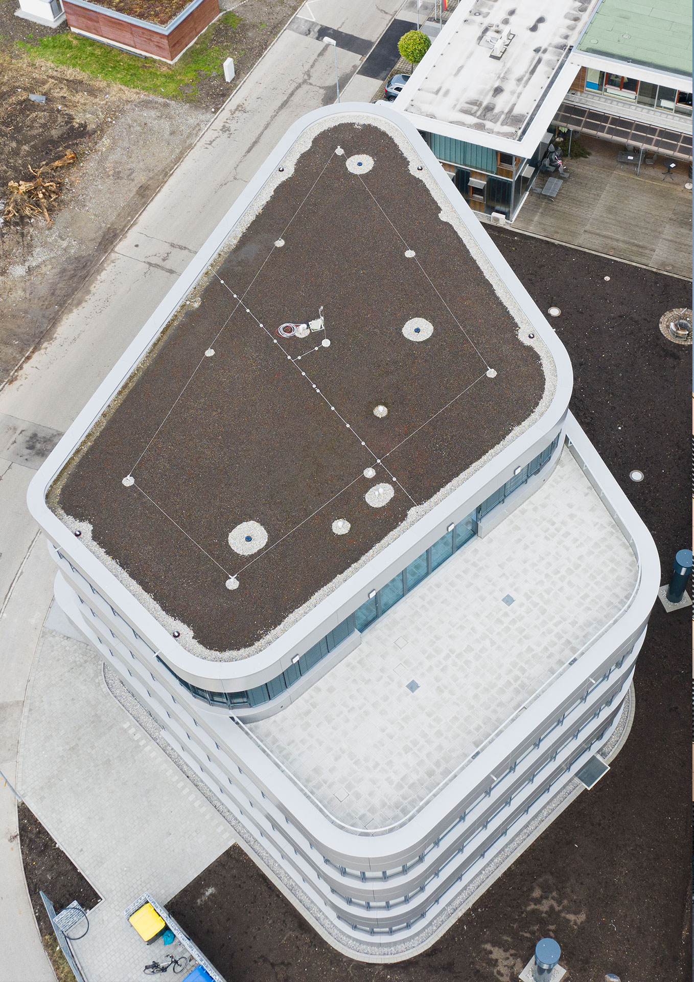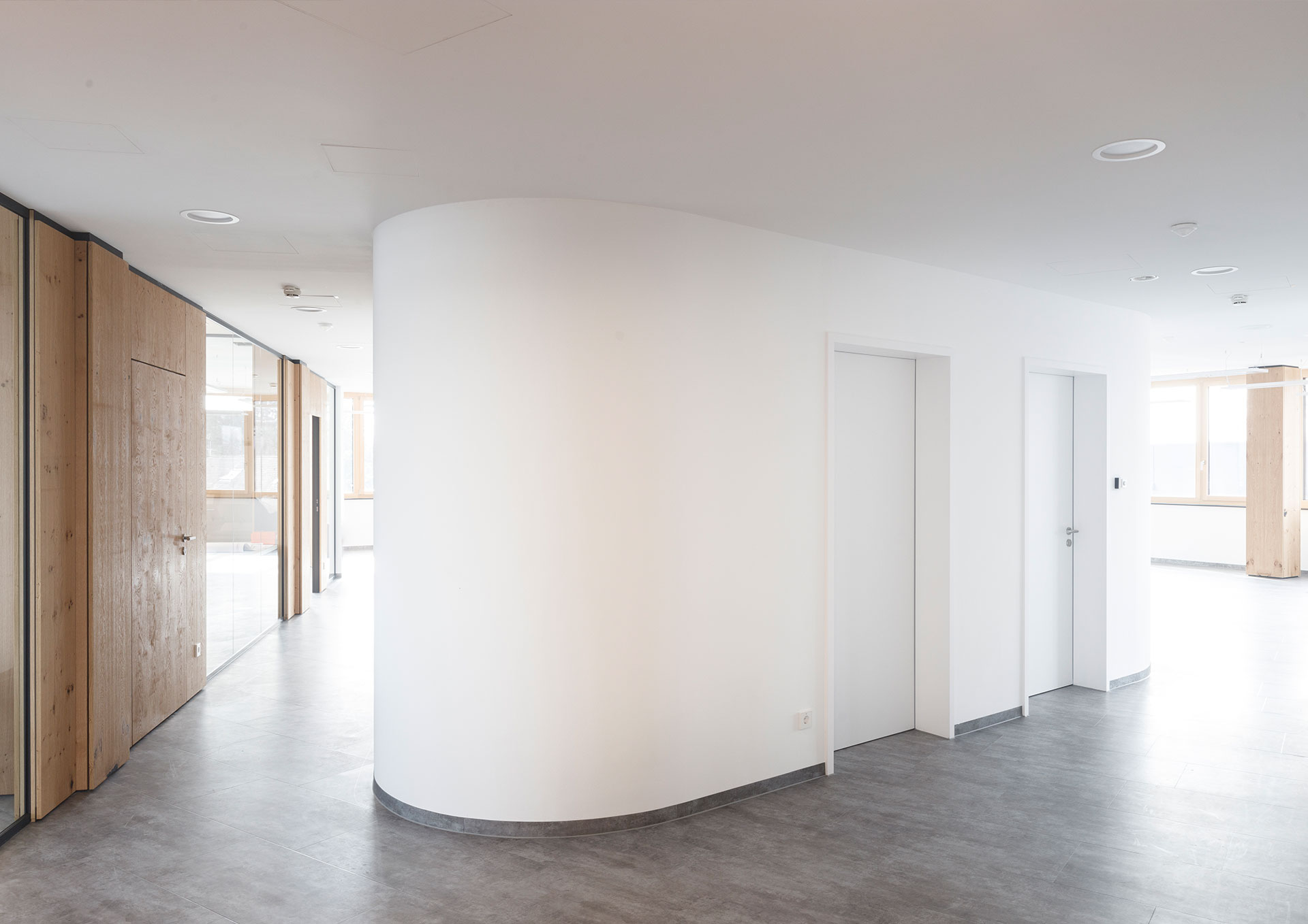 Projektbeschrieb: Der viergeschossige Baukörper beherbergt Büroflächen in mehreren Nutzungseinheiten. Er orientiert sich mit seiner fließenden, organischen Form am bestehenden Straßenverlauf. Fluchten werden aufgenommen und zusammengeführt. Trotz seiner Einbindung in den städtebaulichen Kontext tritt das Gebäude dennoch als prägnanter Solitär in Erscheinung.