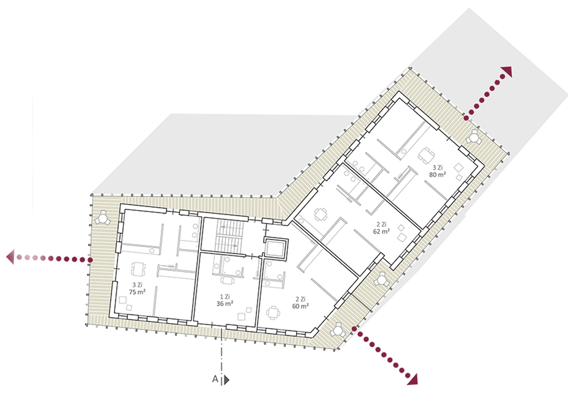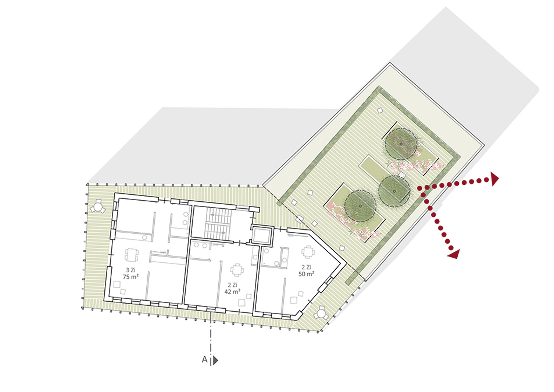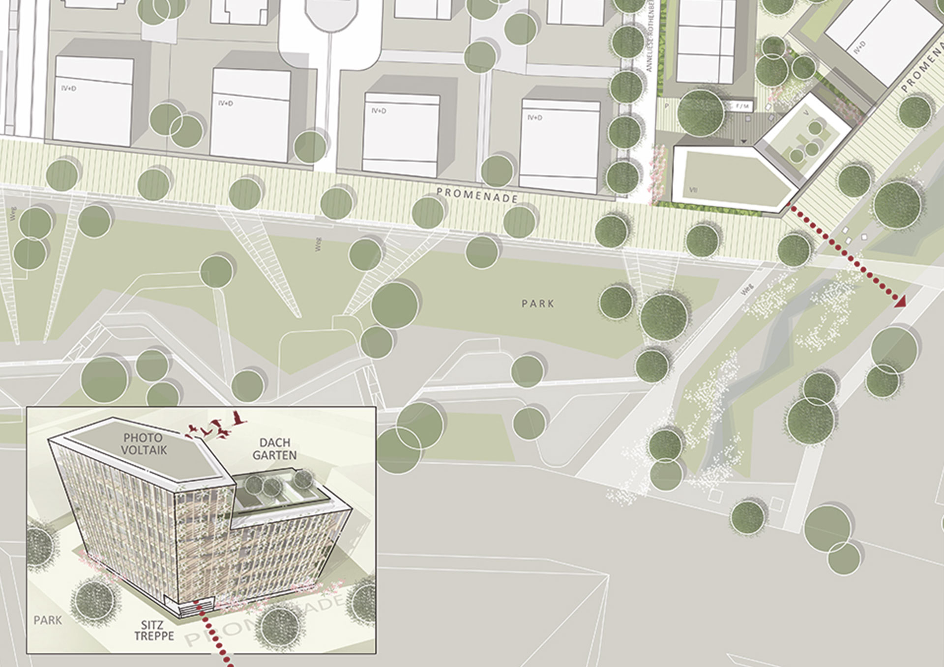 Projektbeschrieb: Das neue Wohnhaus hebt sich aus der umgebenden drei- bis viergeschossigen Bebauung durch eine Überhöhung auf fünf und sieben Geschosse hervor. Ein allseitig von Holzlisenen flankierter offener Umgang bietet dem Neubau eine begrünte Übergangszone zwischen Architektur und Außenraum. Die luftig anmutende, begehbare Hülle verleiht dem Gebäude eine angemessene städtebauliche Präsenz und betont durch die Materiali-tät und erdgebundene Rankbegrünung die ökologische Grundhaltung des Projekts. Insgesamt werden auf den sieben Geschossen 30 Wohneinheiten mit einer Wohnfläche von 1860 m² sowie ein multifunktional nutzbarer erdgeschossiger Raum mit 40 m² Nutzfläche angeboten.