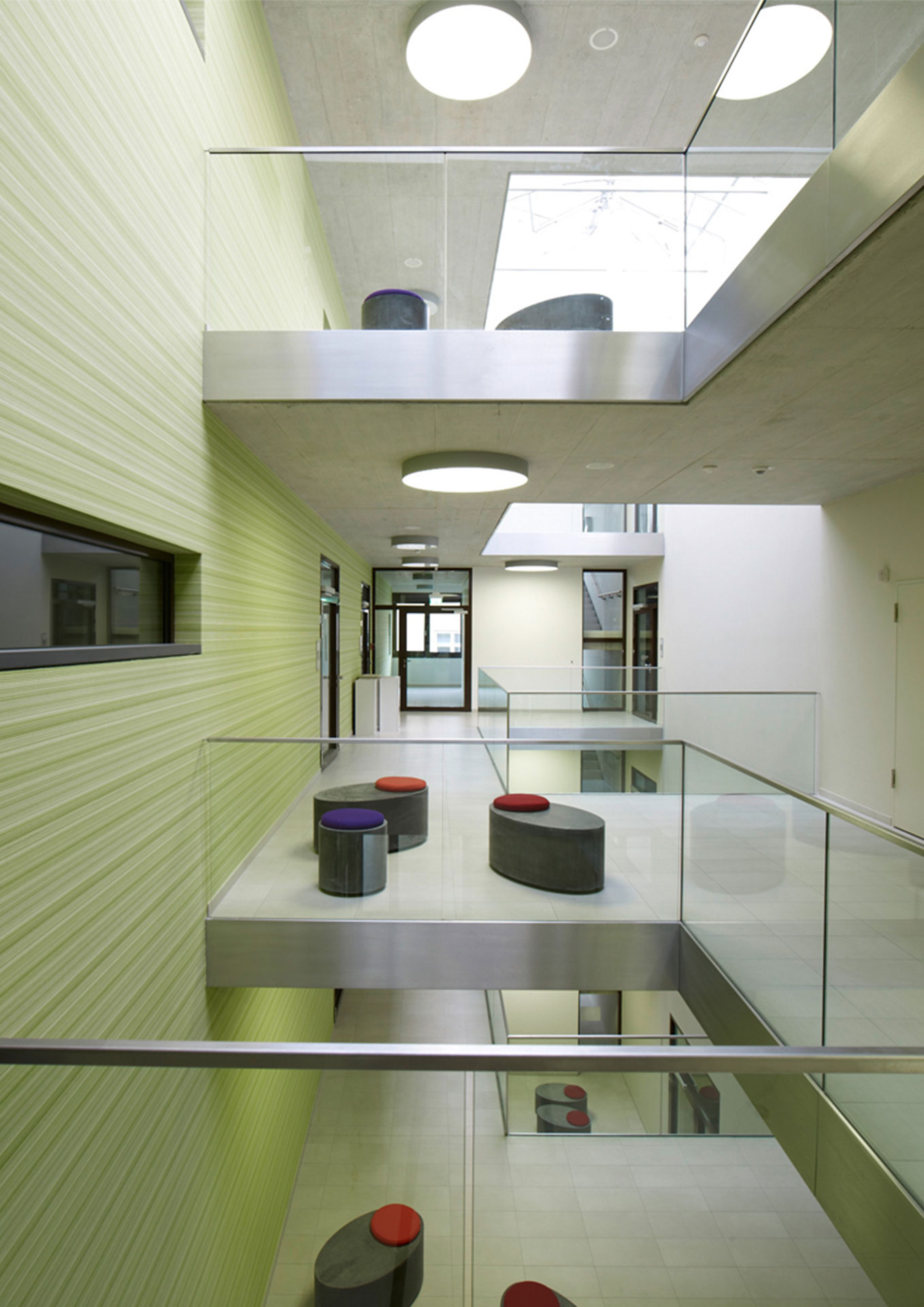 Projektbeschrieb: Facharztzentrum mit 10 Praxen und einem Ambulanten Operationszentrum, direkte Anbindung an das Klinikum. Das Atrium ist Dreh- und Angelpunkt des Hauses. Es fungiert als helle, freundliche Erschließungszone zu den einzelnen Praxen und bietet einladende Bereiche zum Sitzen und Verweilen.