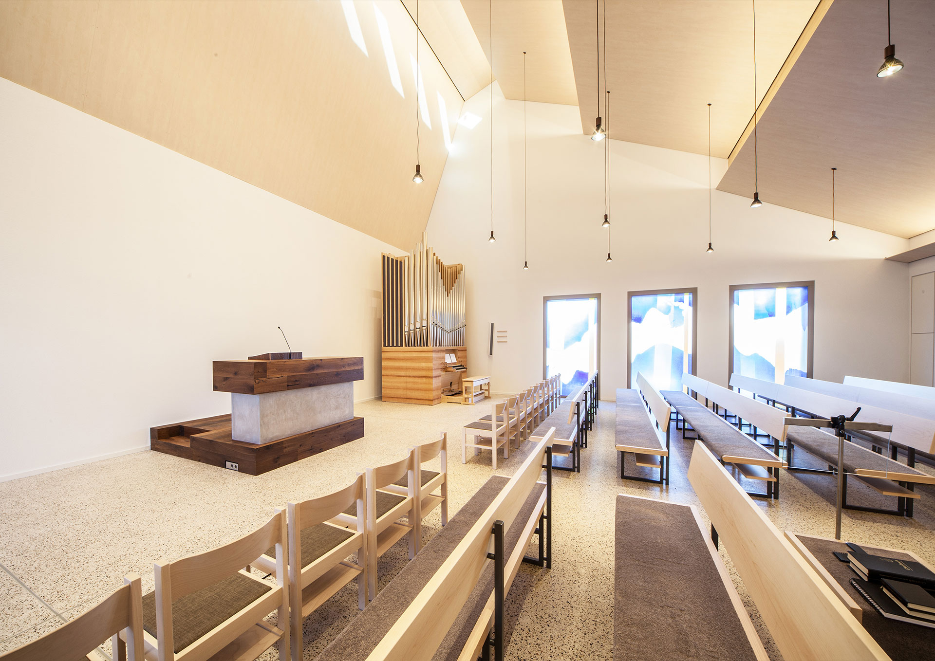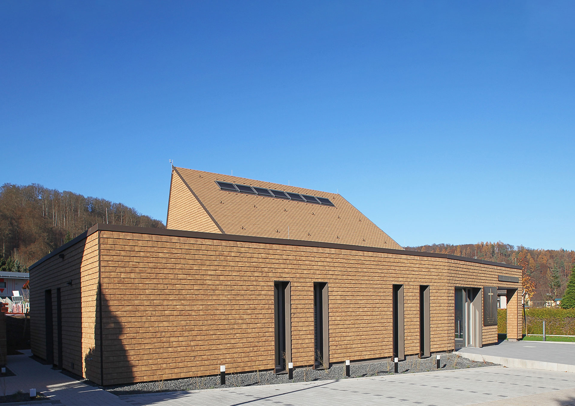 Projektbeschrieb: Das Erscheinungsbild wird geprägt durch eine Fassade, bei der Ziegelplatten gewählt wurden. Diese werden für Dach und Wand gleicher-maßen eingesetzt. Das Gebäude wird so zu etwas Ganzheitlichem, als wäre es aus nur einem Material entstanden. Das Gebäude erscheint monolithisch, ohne Überstand, Dachrinnen und Bruch zwischen Wand und Dach.