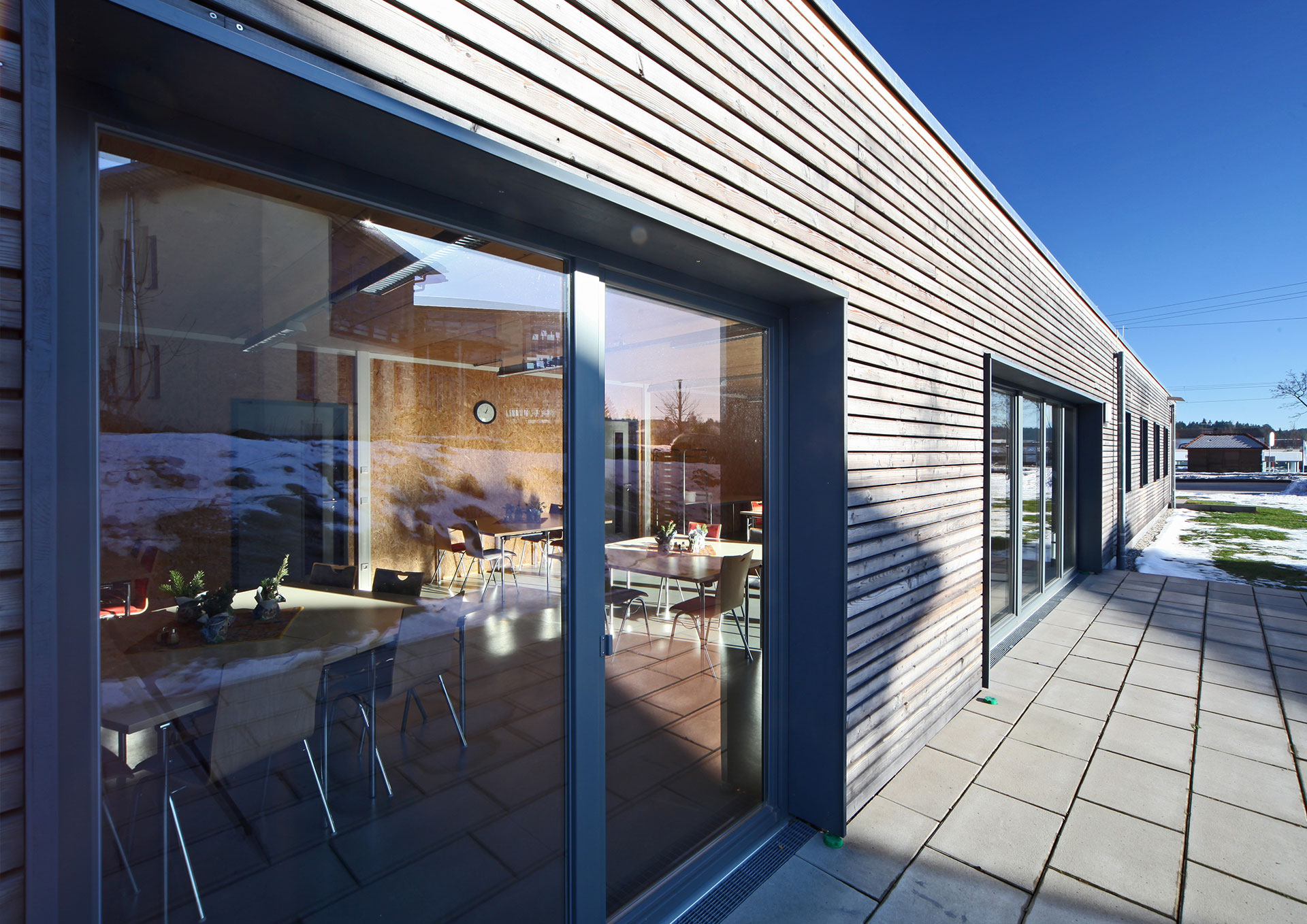 Projektbeschrieb: Das Büro- und Laborgebäude besteht aus zwei Riegeln. Diese werden im Erdgeschoss über ein kleines Foyer miteinander verbunden. Während der eine, 6-geschossige Gebäudeteil überwiegend Büroflächen beinhaltet, sind im zweiten 5-geschossigen Riegel Laborflächen vorhanden. Das Motiv der langgezogenen Bandfassaden wird aufgegriffen, wobei die Elementfassade aus Aluminium spielerisch gebrochen wird.